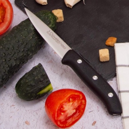 - Cuchillo pequeño de hoja fuerte, filo liso y punta estable. Limpia, pela y corta pequeñas frutas y verduras.